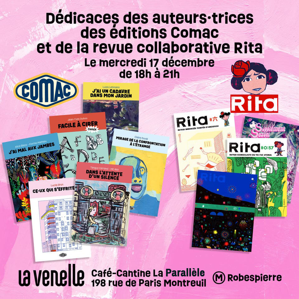 Lancement en compagnie de ses camarades de Comac et Rita le mercredi 17 décembre de 18h à 21h à Montreuil Robespierre, au café-cantine LA PARALLÈLE, accessible depuis le 198 rue de Paris, en passant par la Venelle, ou au 159 rue Étienne Marcel.